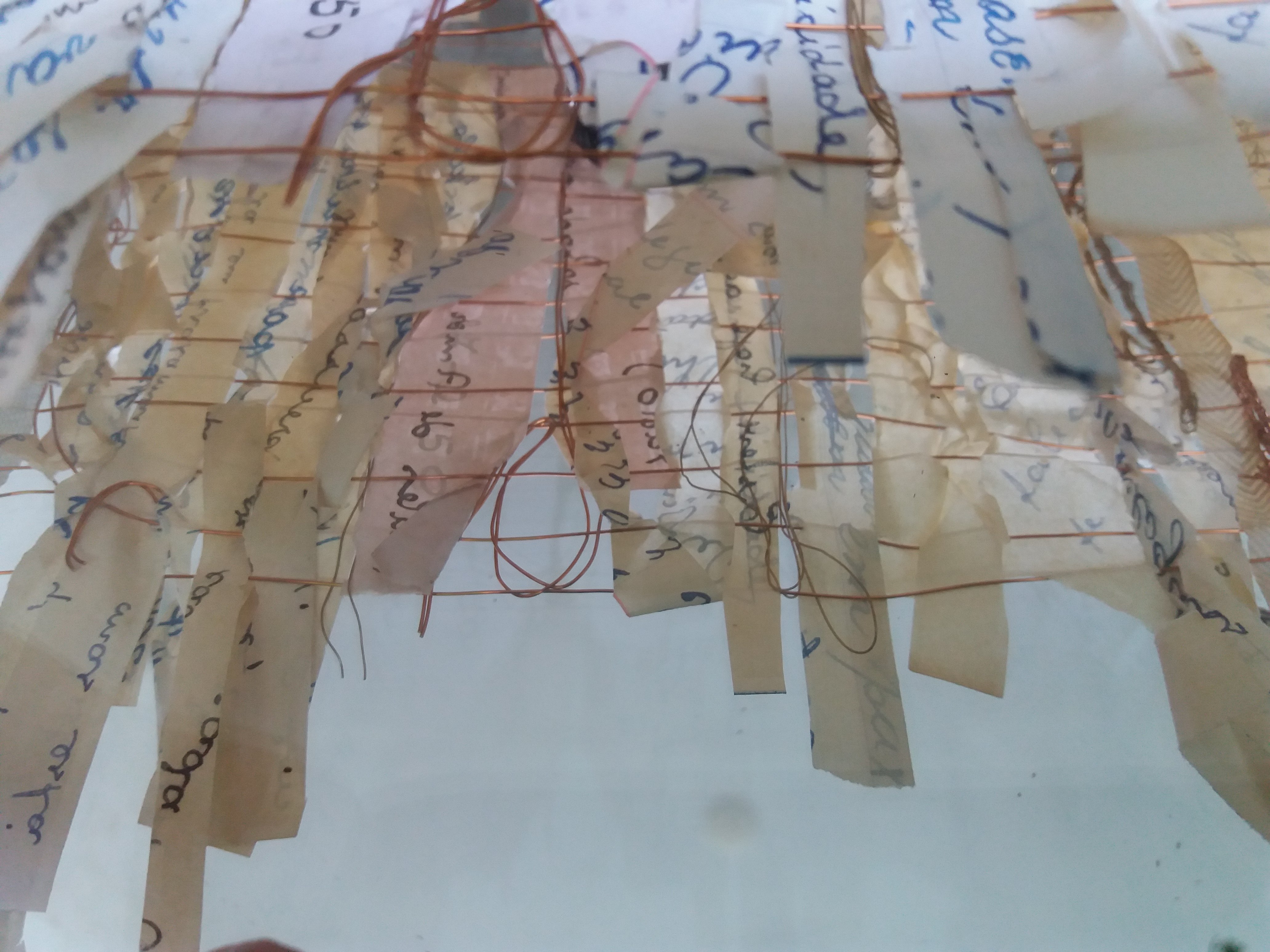 O processo de criação artística parte da manualidade mais arcaica, o tecer das cartas originais paternas; feltrar uma resposta minha, aproximando temporalidades desprendidas de significado, surgindo assim a escrita não semântica onde as palavras escapam, uma das marcas dessa série. Da materialidade bruta passo a experimentos virtuais: ampliar, reduzir, xerocar, fazer cópias das cópias. Agora todo o corpo é fisgado nas intervenções e no território onde apagamento e acaso cortejam o impercebido, uma nova dimensão surge: o fracasso da linguagem.